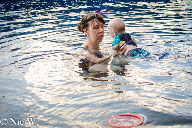 Then I got two kids at once! Astrid was keen on giving her brother cuddles in the pool. I swear that is his laughing face, despite the fact he looks like he is screaming……..