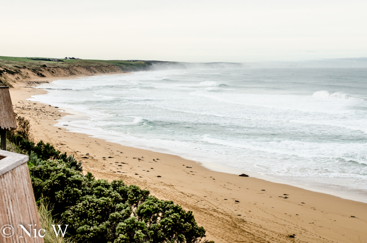 It was a lovely clear (but cool) morning and we were hoping for better weather for the day ahead. The first stop for the morning was Logan’s beach in Warrnambool. Logan’s beach often hosts whales for part of the year, and it was whale watching season so we were hoping for a glimpse. There is a large viewing platform at the beach and when we arrived there were quite a few people crowding the platform. In all honesty we didn’t expect to see any whales but as soon as we arrived, sure enough there were whales! They were a little too far away to get good photos of with the lenses we had with us but the black blobs in the photos below are in fact whales. We think there were at least 2, but there might have been more. We could see them moving around and the spray from their blowholes.