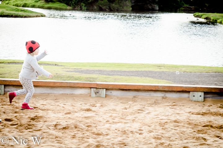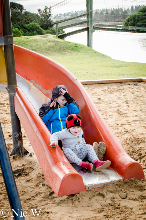 Astrid loved playing on the various slides, in the sand and on the merry-go-round. Some of the slides were quite large (Alexander had to help Astrid down one she got stuck on) and Tabitha got her weekly work out pushing all the kids on the tyre swings!. In typical Warrnambool style we got rained on, nearly blown over and periods of sunshine. The kids had a great run around (Soren eventually slept in the ergo) and the majority of the children ended up in mud at some point…