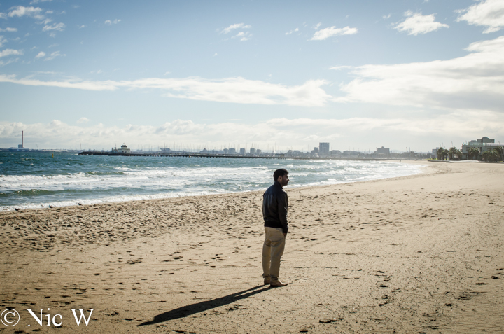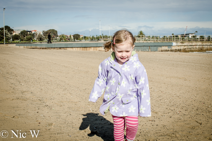 All full we wandered back down the street via a supermarket for some supplies. We then had to go back to the cake shops to purchase afternoon tea. On our initial stroll down the street, Astrid had spied a chocolate sail boat cake and decided that was what she wanted. We located the chocolate sail boat and purchased it, along with some other tasty treats for the adults. We intended to walk down the Esplanade and along the beach but it was raining and really windy. We ended up walking down to St Kilda beach for a wander. It was very windy and it was us and other tourists there….. We didn’t last too long but the brief sunshine was lovely between the icy winds. Melbourne was living up to it’s 4 seasons in one day reputation.