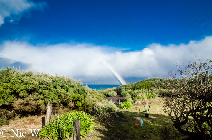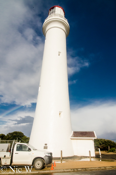 We drove through Anglesea, which was another pretty town but didn’t stop. The next stop was Airley’s inlet, where we hoped to visit the lighthouse. You can actually see the Airley’s Inlet lighthouse from Lorne when the weather is clear. Unlike our visit to the Port Fairy lighthouse, which involved a reasonable amount of walking, the Airley’s Inlet lighthouse was right next to the carpark at the top of a hill. As we reached the lighthouse the rain had stopped and there was a pretty impressive rainbow. With a still sleeping Soren, Astrid and Anto went to check out the lighthouse (and rainbow) but returned very promptly before the next rain shower hit.
