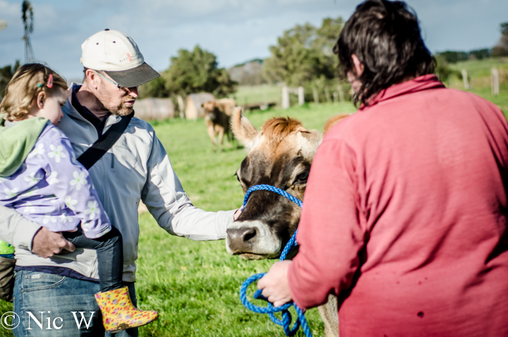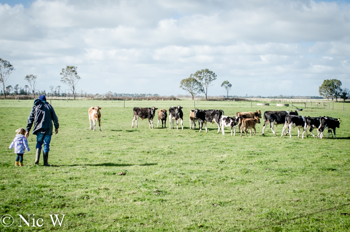 Astrid and Soren were very excited to be released from the car and to explore their surroundings. After a drink and a chat we donned the gum boots and headed out to the muddy paddocks to visit the cows. Astrid loved chasing the calves, and then talking to the herd of cows (who thought that they should be getting more food out of us).