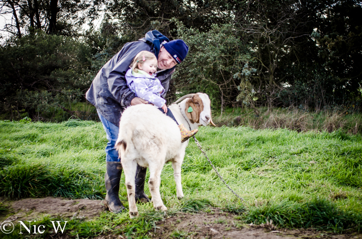 After communing with the cows it was time to go and meet the pet goat. The goat thought Astrid was fun to play with, unfortunately the goat was bigger!