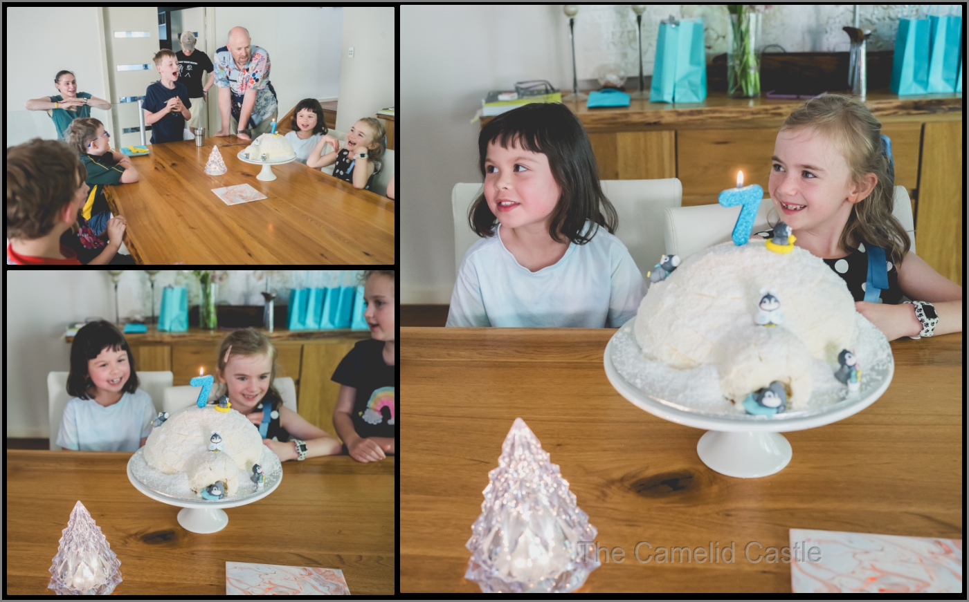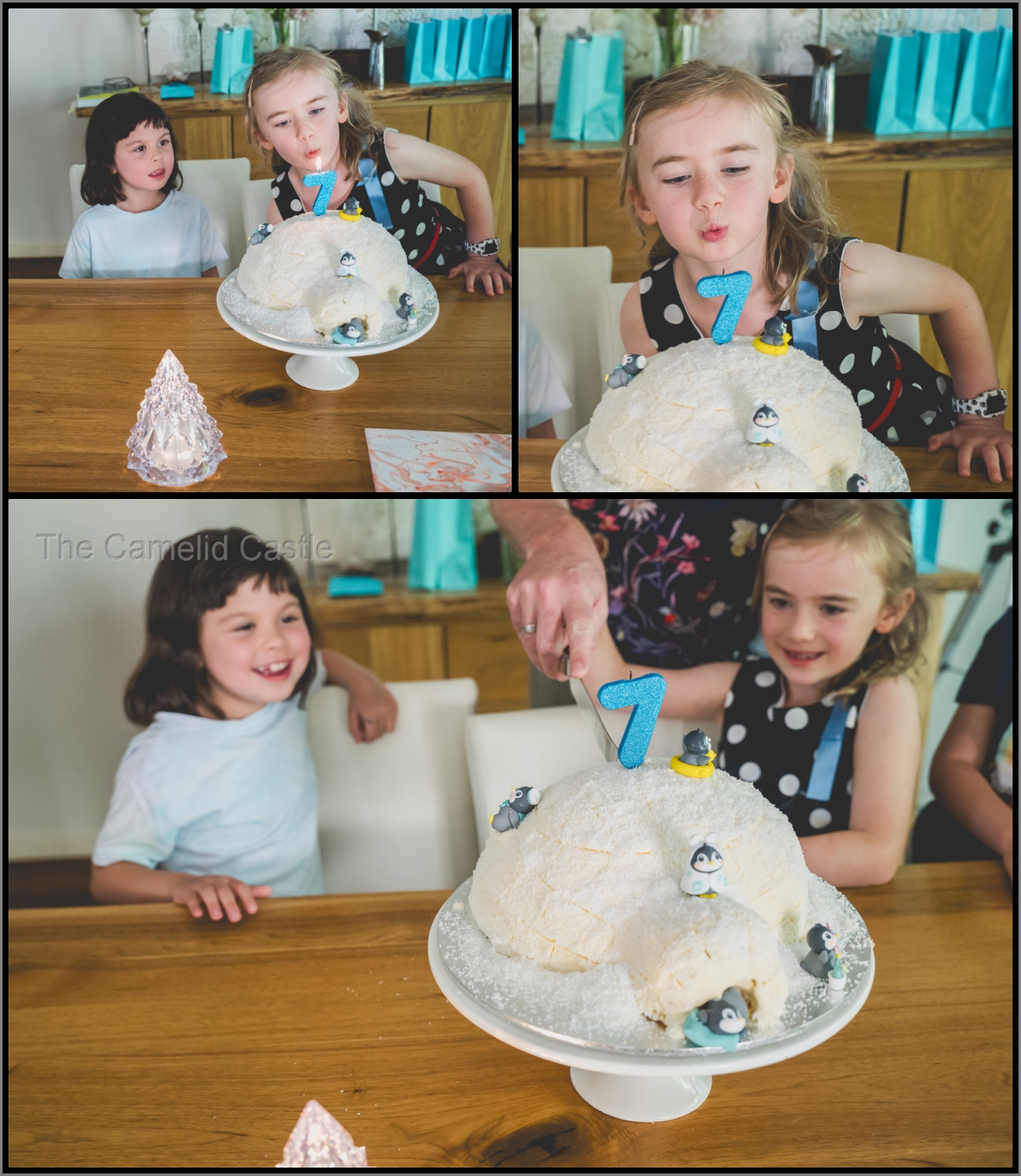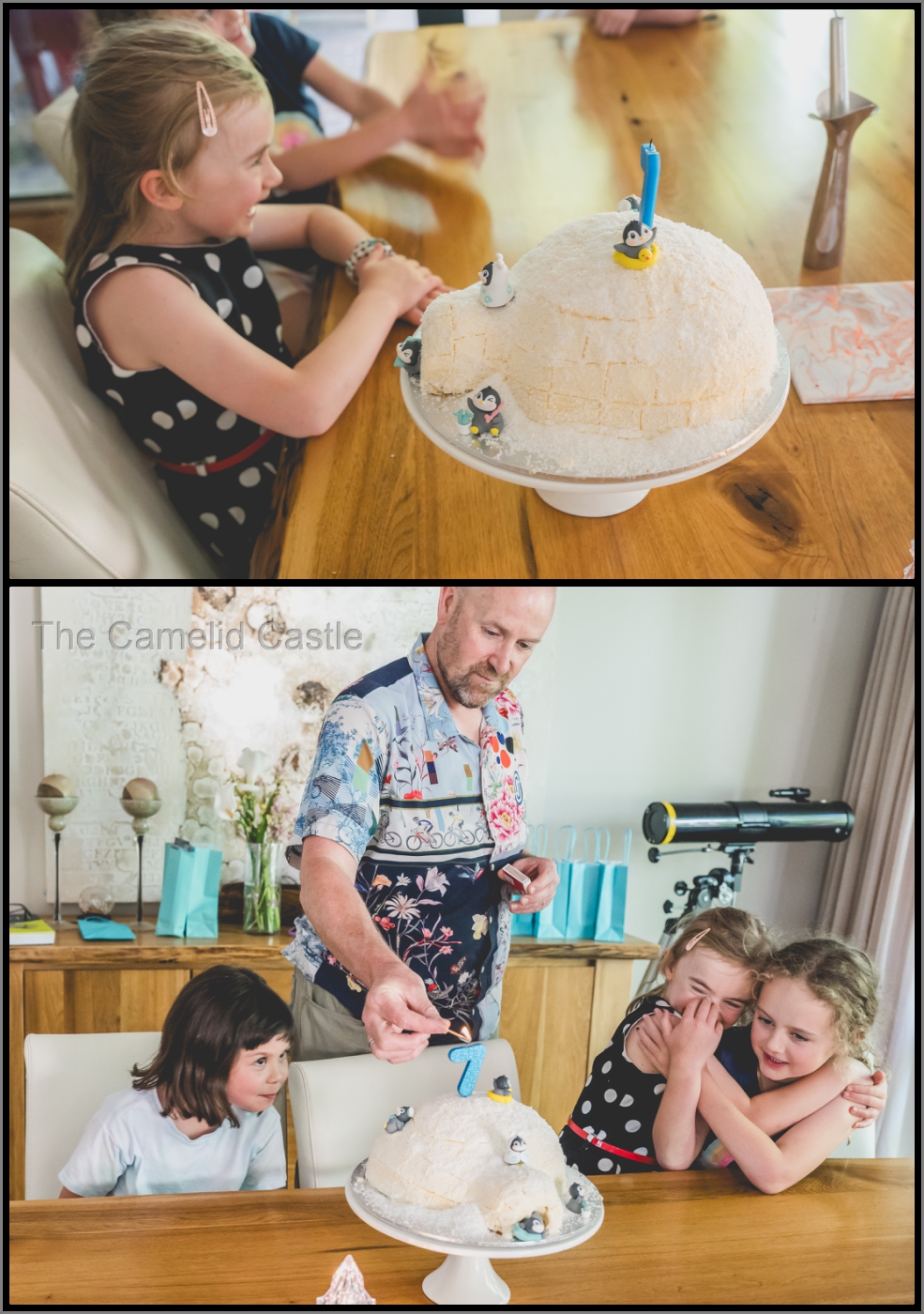 After the quiz was done, and Astrid was collating results, the igloo cake was whipped out of the freezer. It was time to light the number 7 candle and sing happy birthday…..