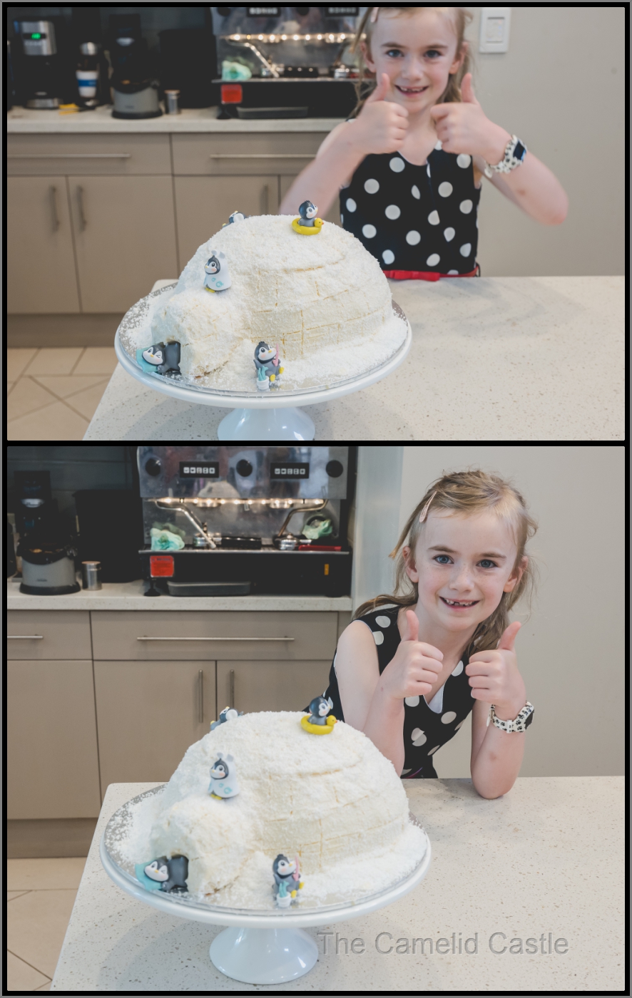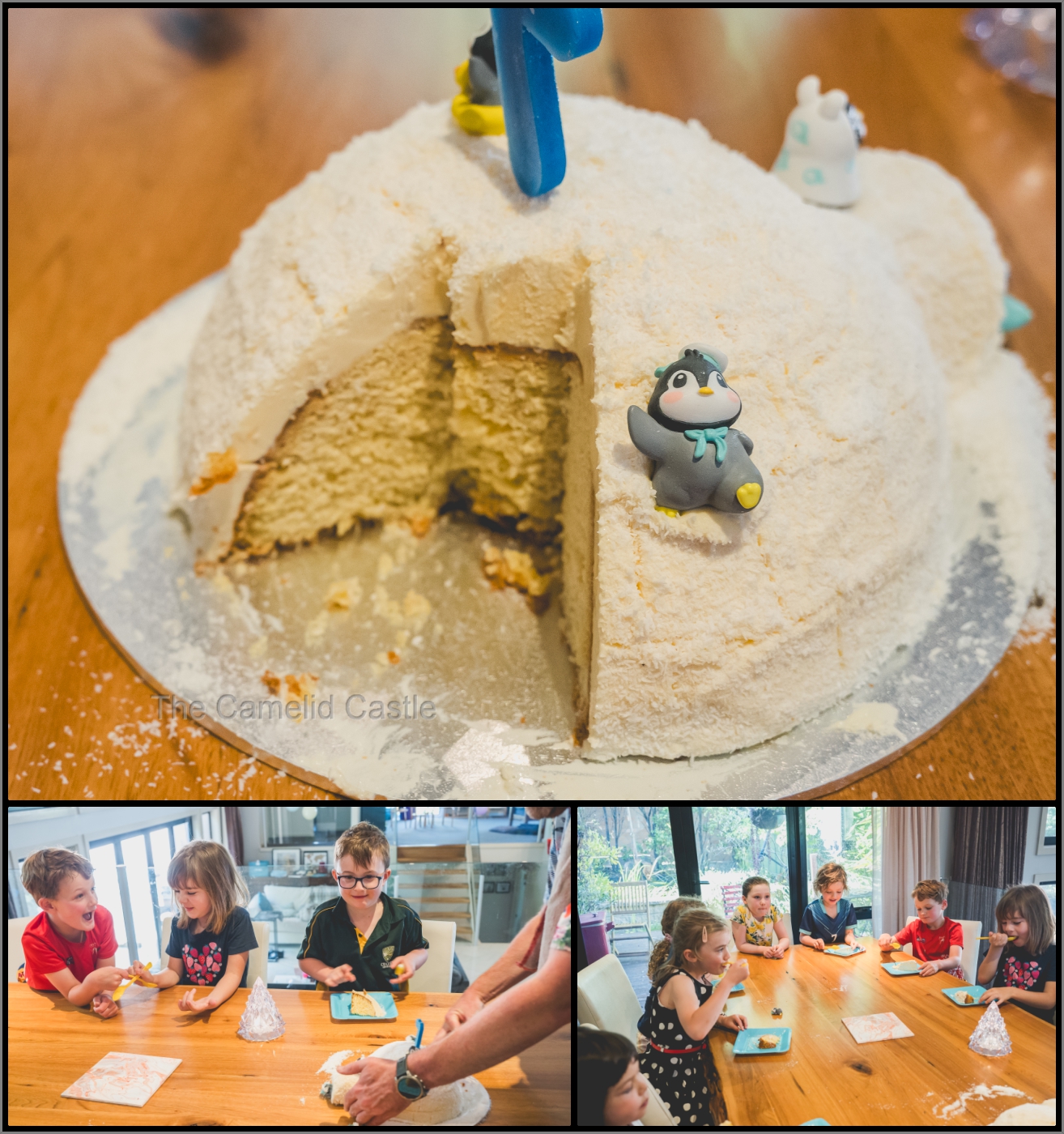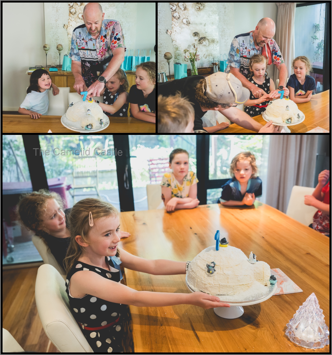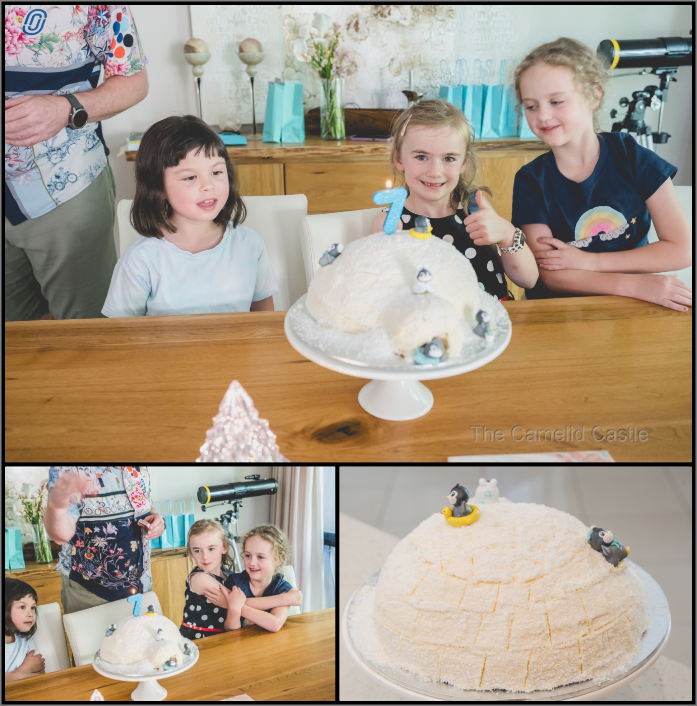 After the quiz was done, and Astrid was collating results, the igloo cake was whipped out of the freezer. It was time to light the number 7 candle and sing happy birthday…..