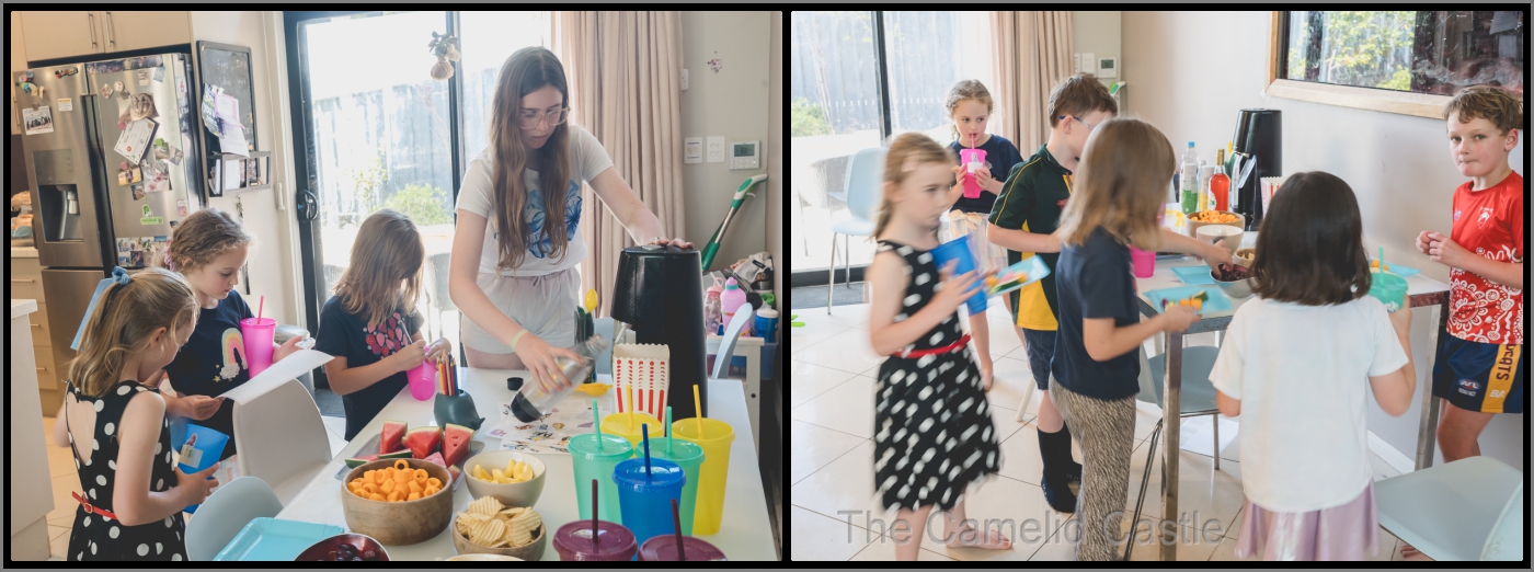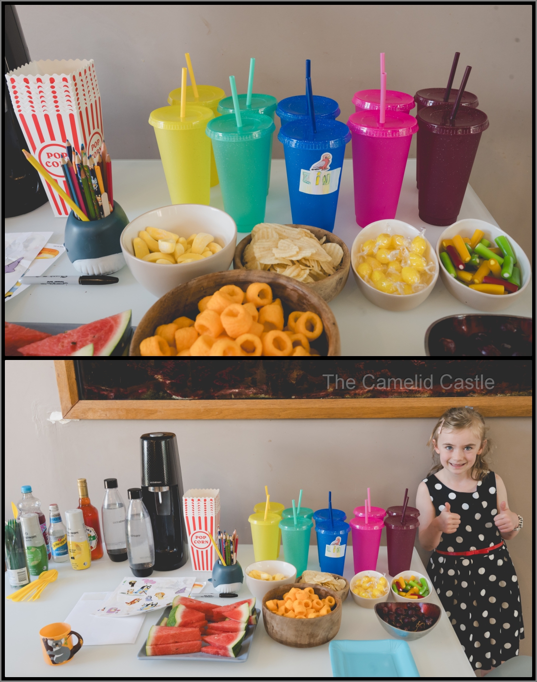 All the kids got to choose their drink cups when they arrived and then decorated a label for their cup. They could then take their cups when they left. The pink cups were the hottest commodity amongst 7 year old girls….