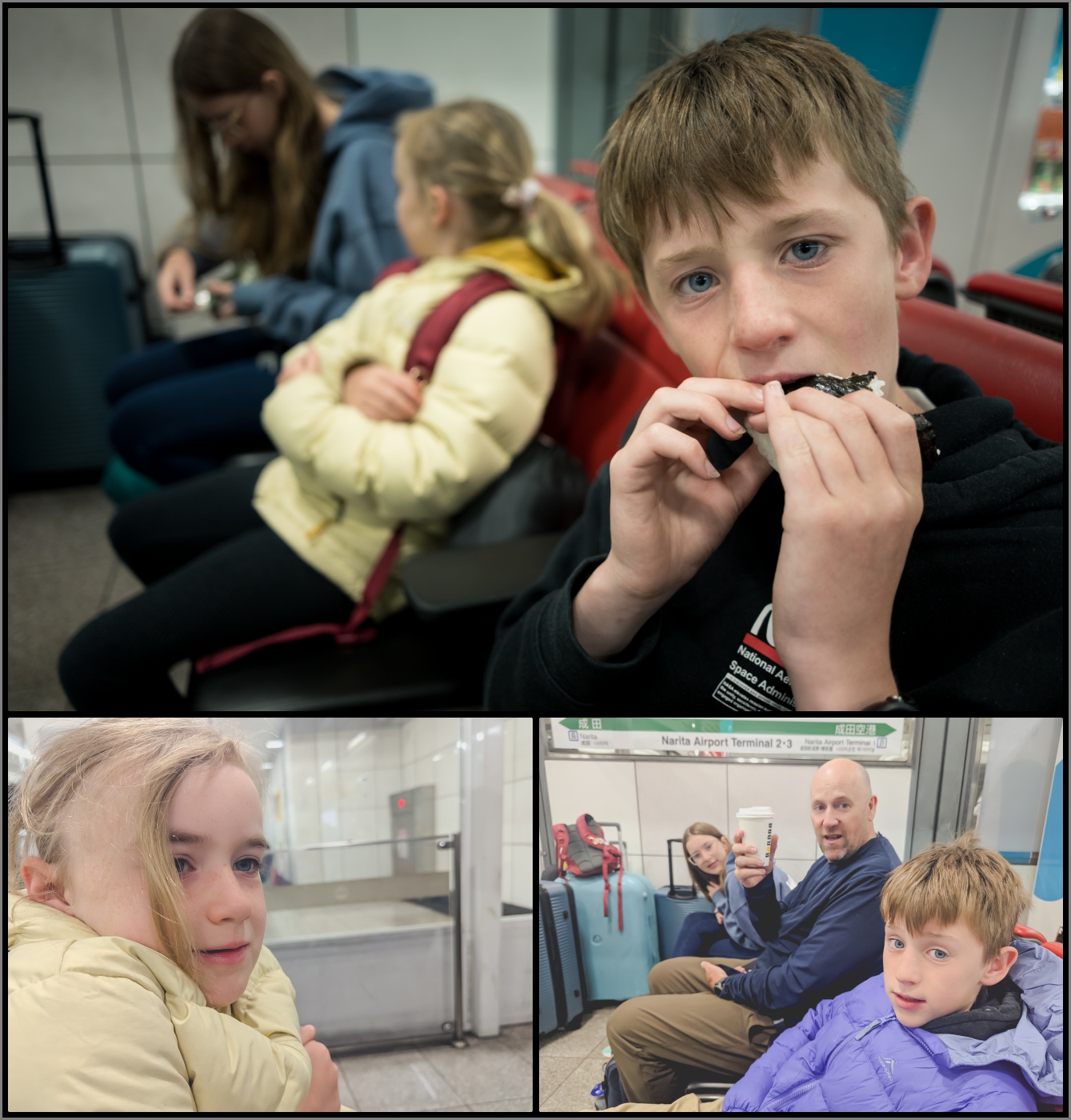 We got through immigration and picked up bags. had to put jackets on as cold already. We grabbed our transport cards and the kids were immediately buying convenience store snacks as it was hours since the middle of the night breakfast. We ate train snacks in the freezing waiting area for the Narita express.