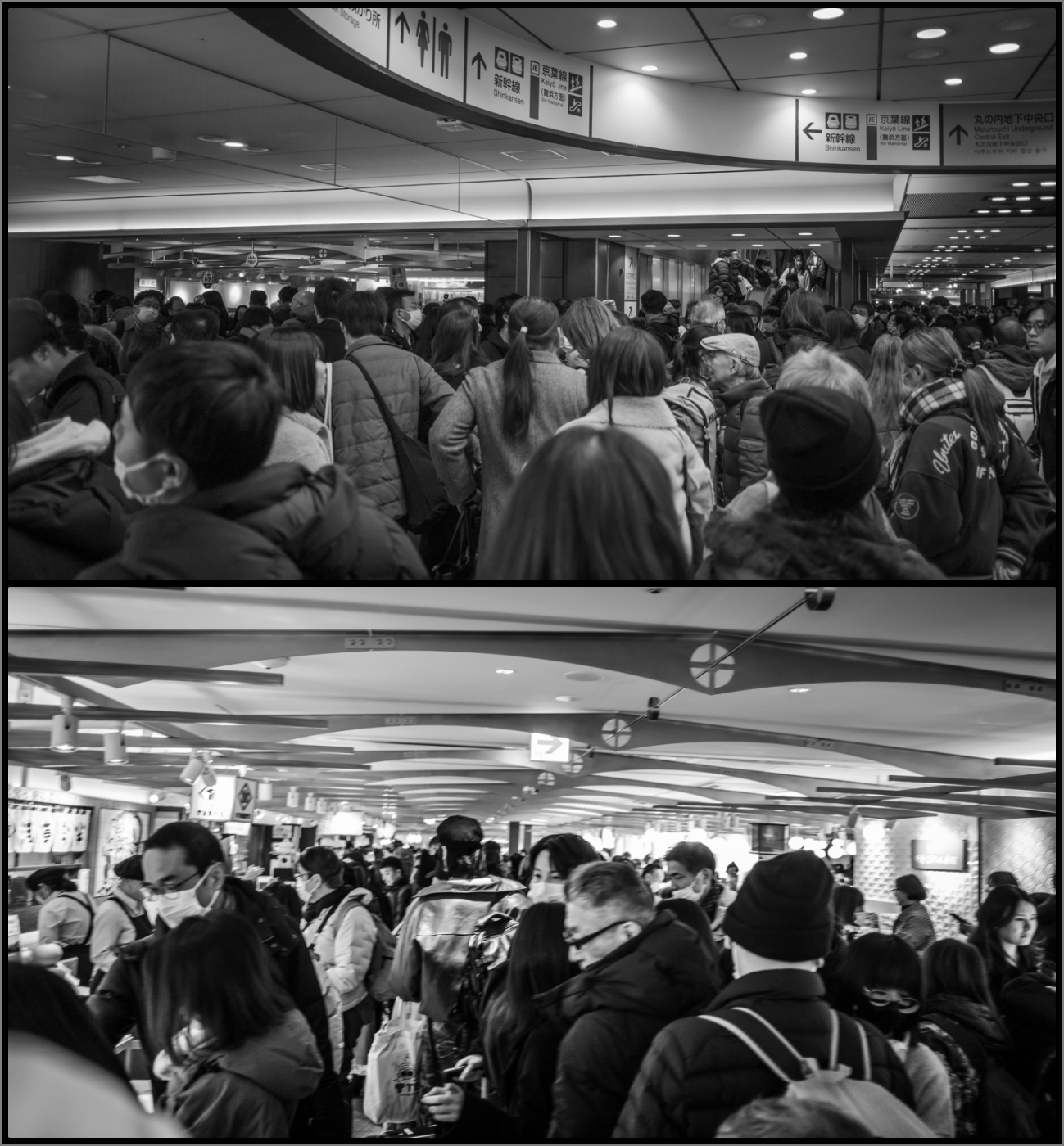 New Year’s is a big holiday in Japan, where everyone goes home to visit family. It was already rather busy at the station, fairly early in the morning. With shinkansens running every 3 minutes to Kyoto all day, we hadn’t originally wanted to book one in advance in case of flight delays, but realised 2 weeks earlier they were selling out…….and only expensive seats were left. We had ended up finding seats on a 12.51pm train that were only half a fortune instead of a full fortune, so had booked those tickets. But knew we’d have to fill in time in Tokyo station in a sleep deprived state.