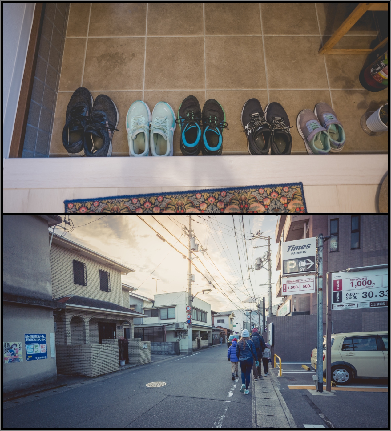 It was a short walk to our apartment and our lovely Airbnb owner met us and explained everything in his much better English than our Japanese. He also, as per Japanese protocol, lined all our shoes up. With a family of giant-footed individuals, my size 9 ladies feet are the smallest bar Zinnia!