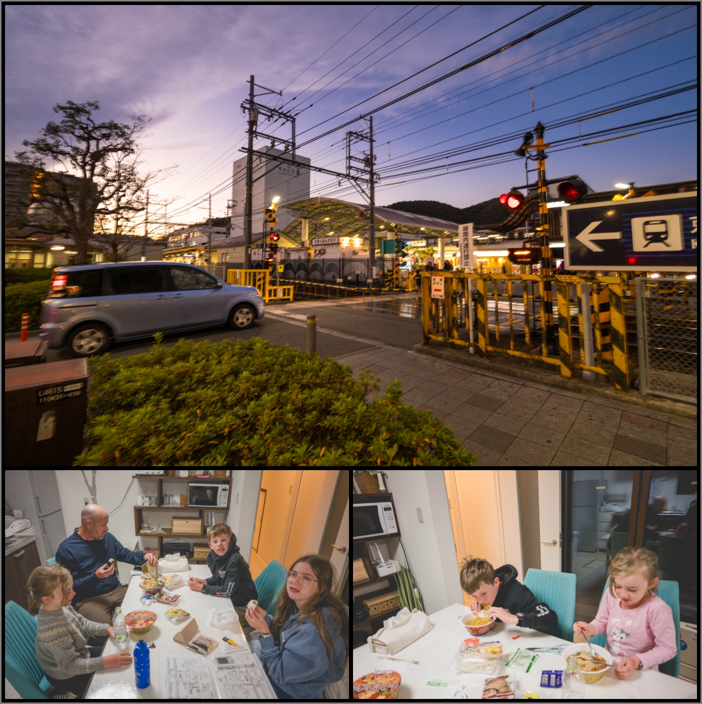 We all napped a bit in the 2 hour trip West to Kyoto. Everyone was still pretty tired when we arrived. It was still only a few degrees when we emerged at around 3.30pm and caught the local JR train the one stop from Kyoto station to Yamashina where our Airbnb was.