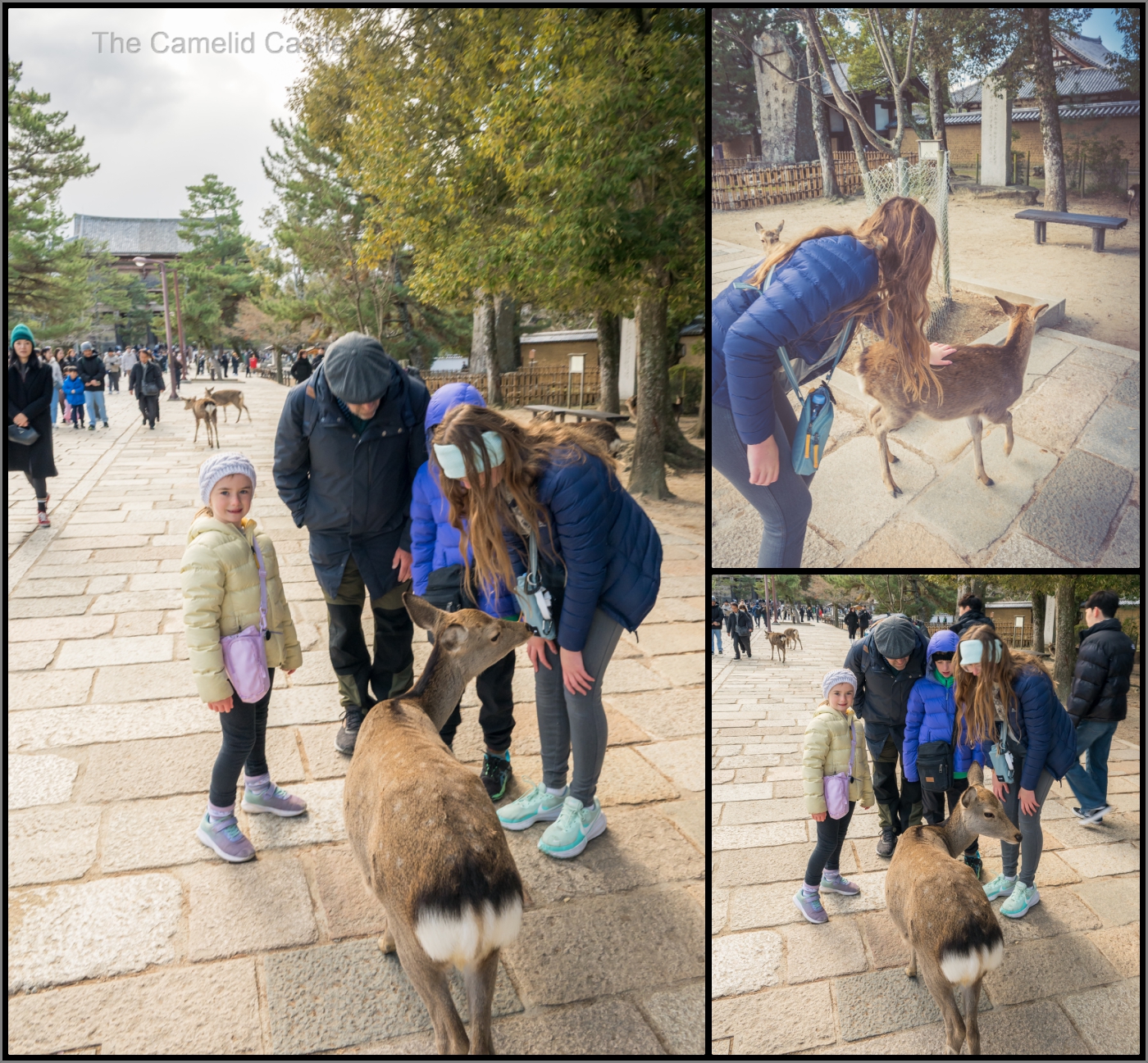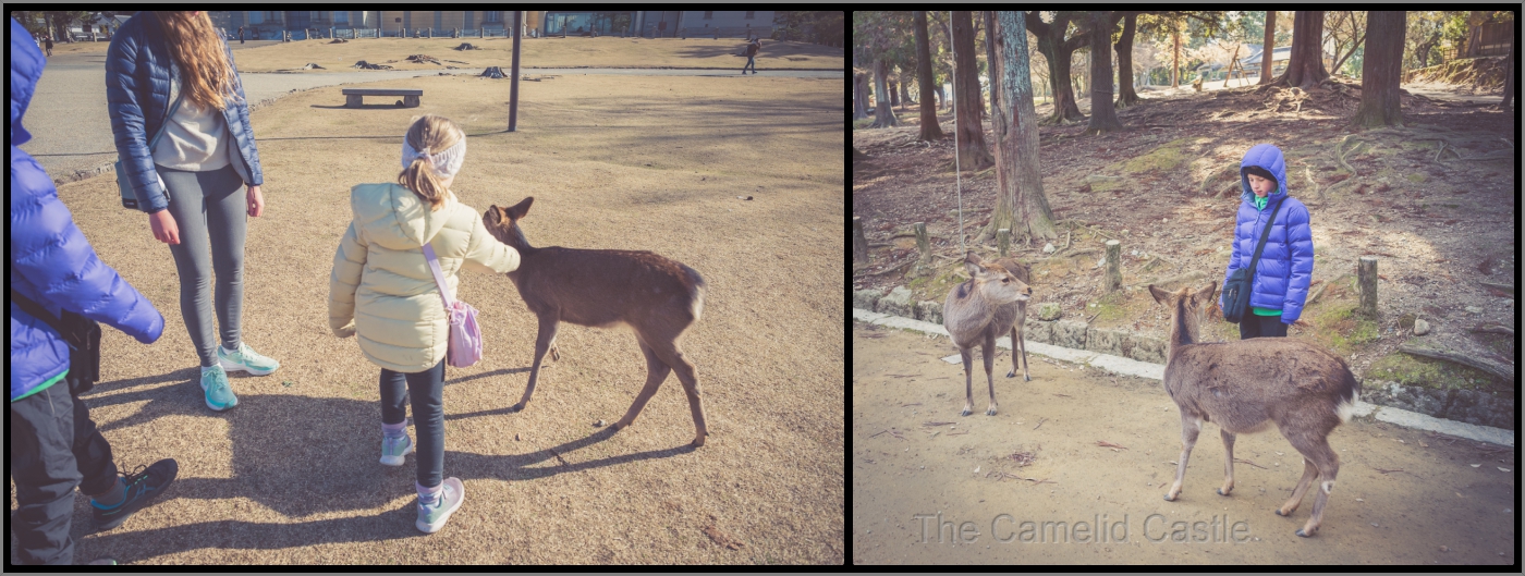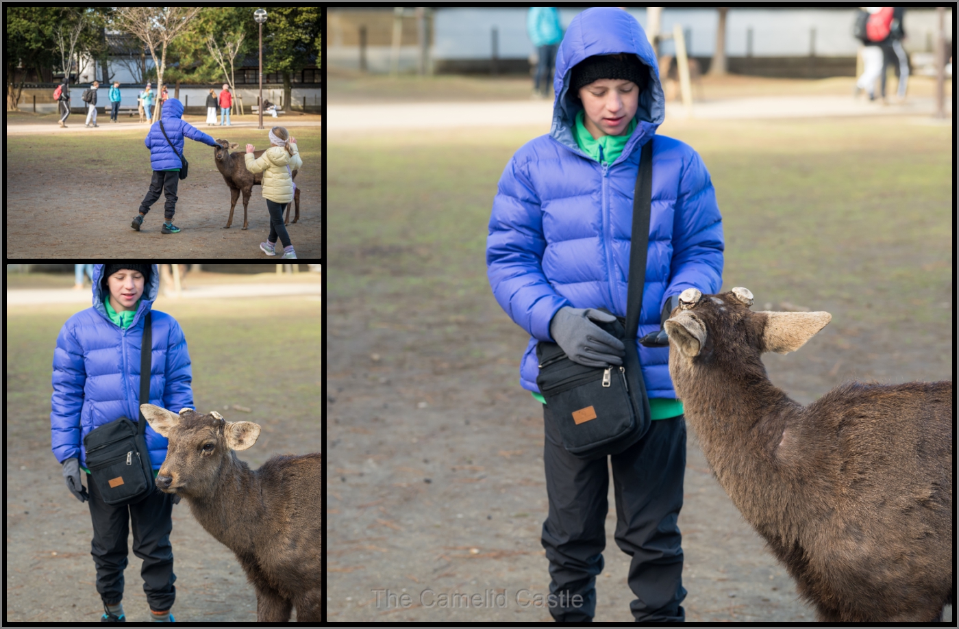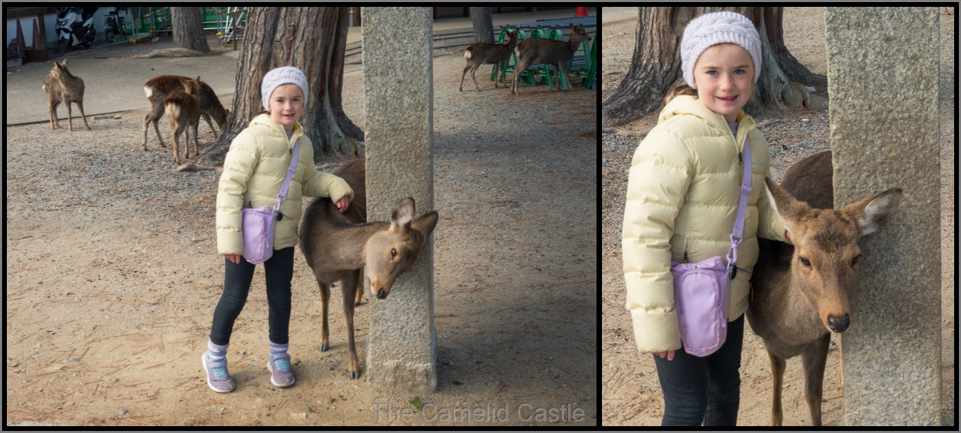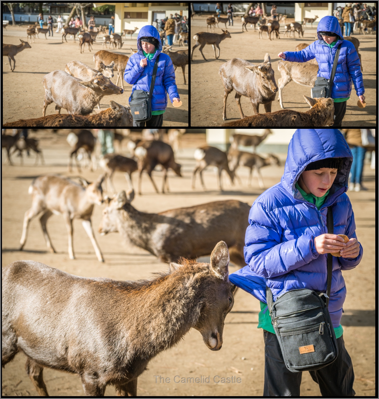 Each kid got a packet of crackers from the first deer cracker seller we found and were immediately mobbed by deer, despite there being plenty of other people around, also handing out crackers. It took about 3.2 seconds for the deer to start running at us.