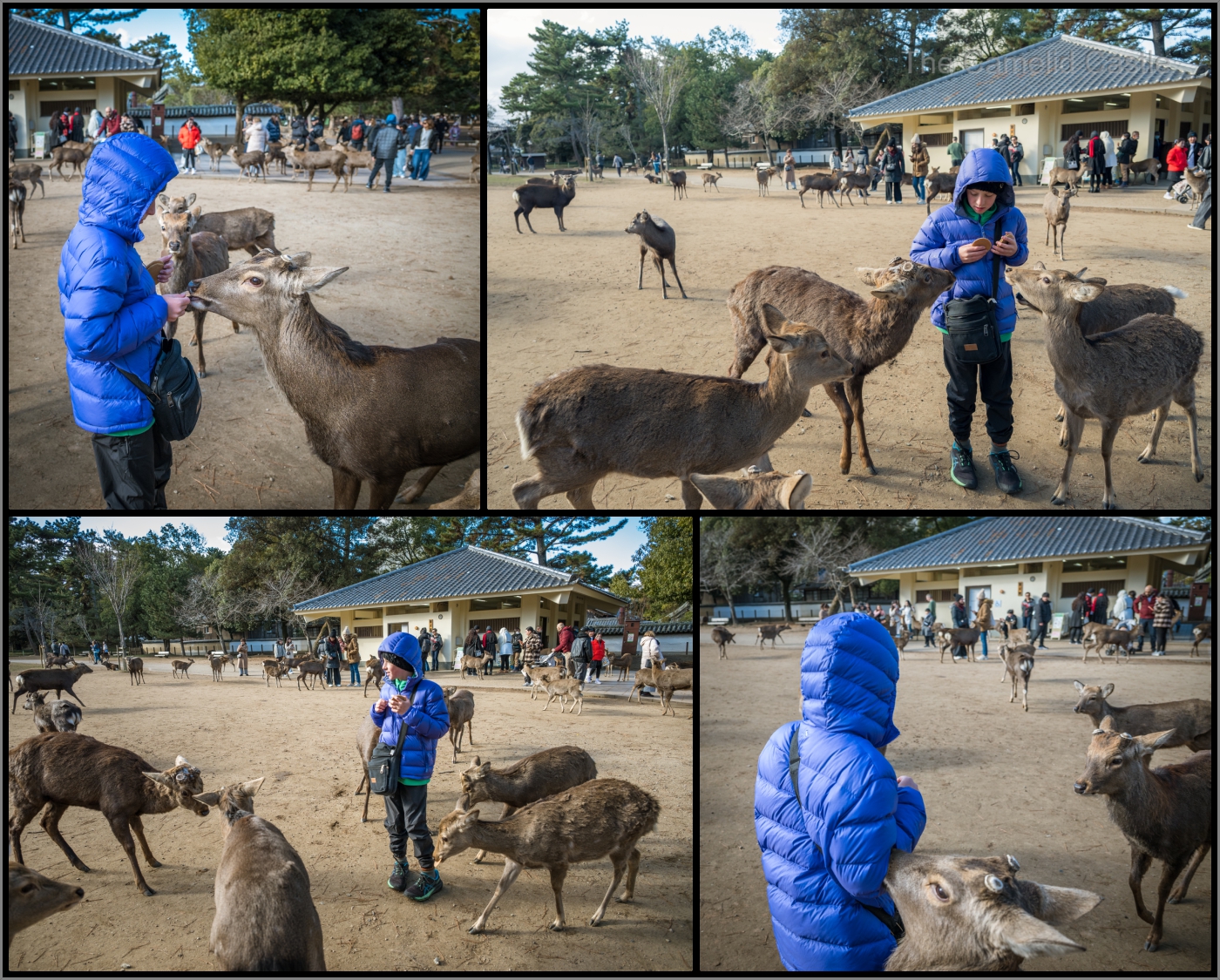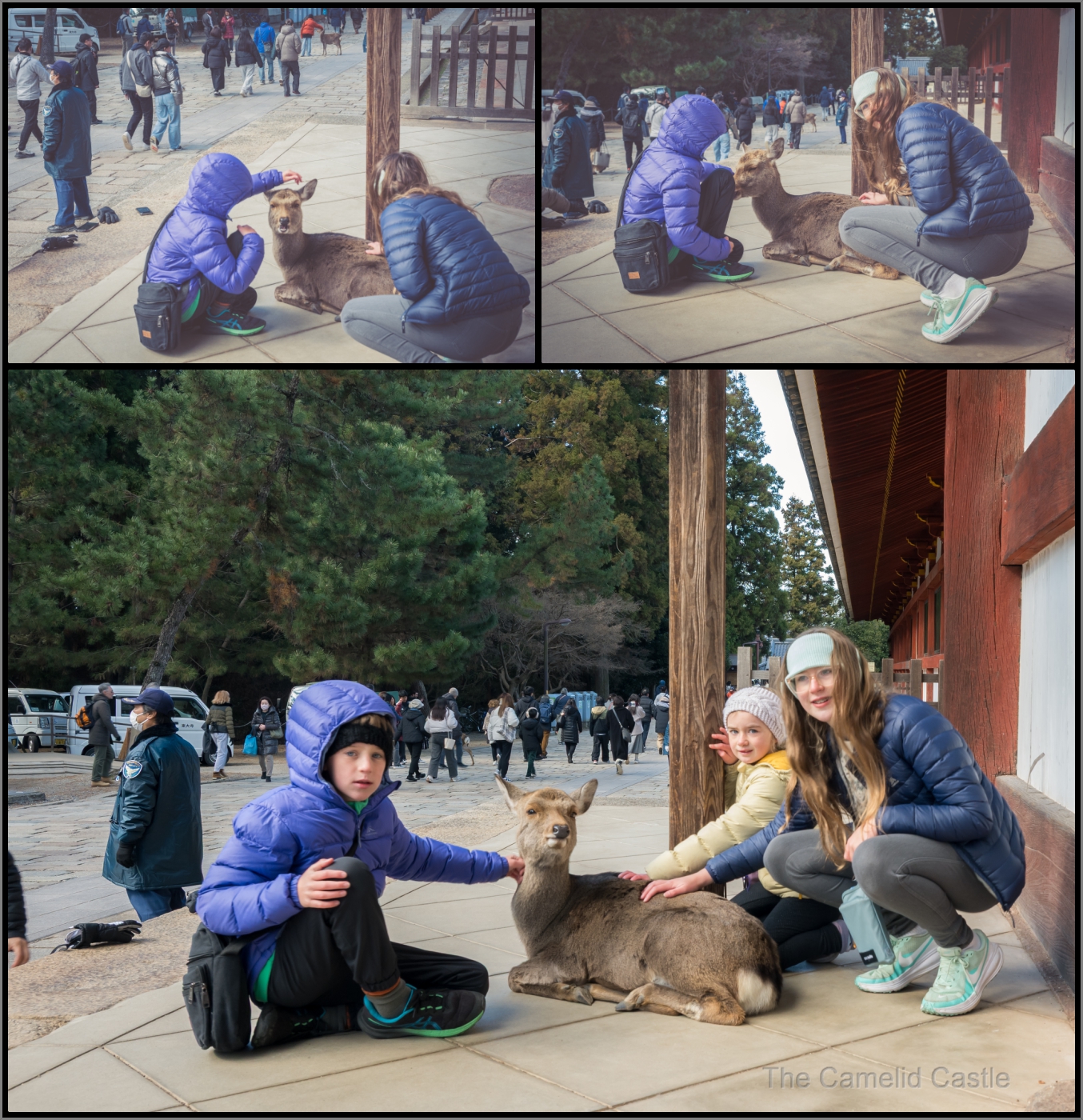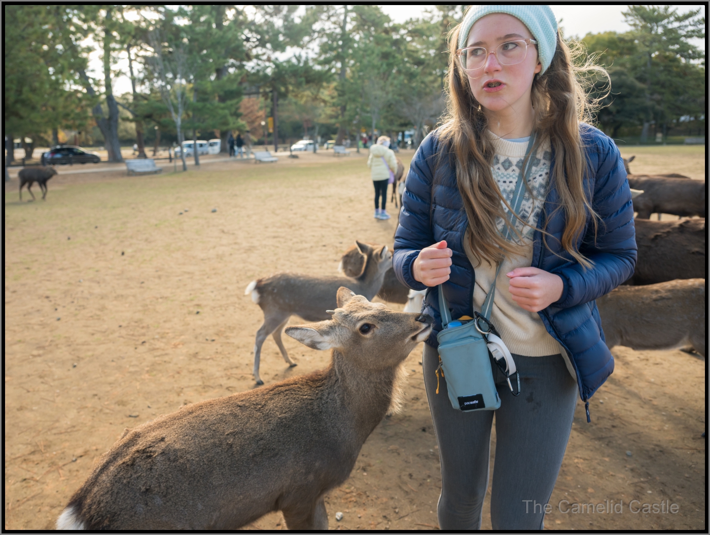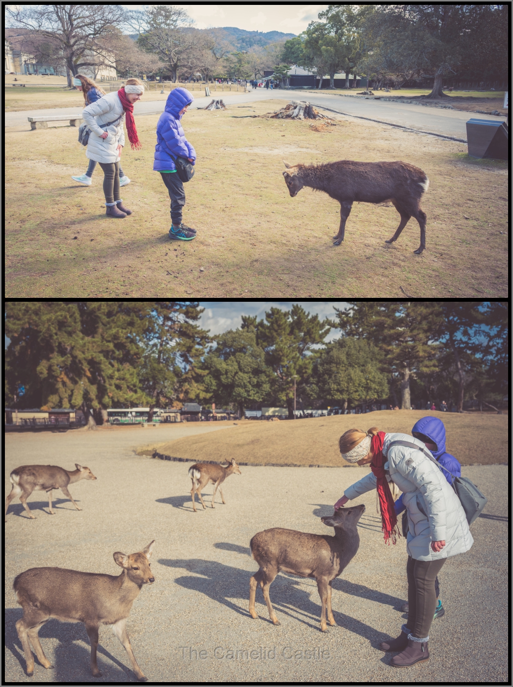 Each kid got a packet of crackers from the first deer cracker seller we found and were immediately mobbed by deer, despite there being plenty of other people around, also handing out crackers. It took about 3.2 seconds for the deer to start running at us.