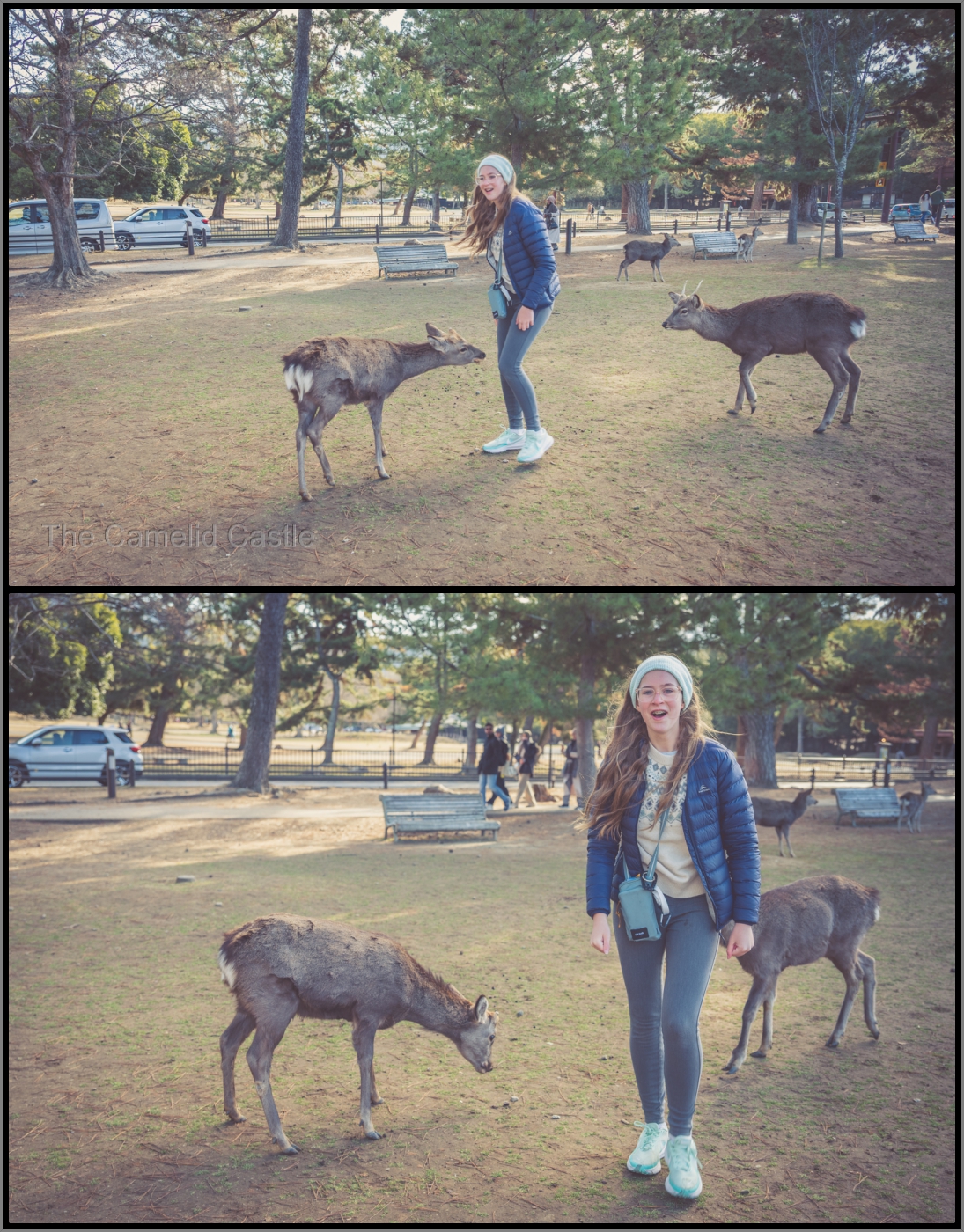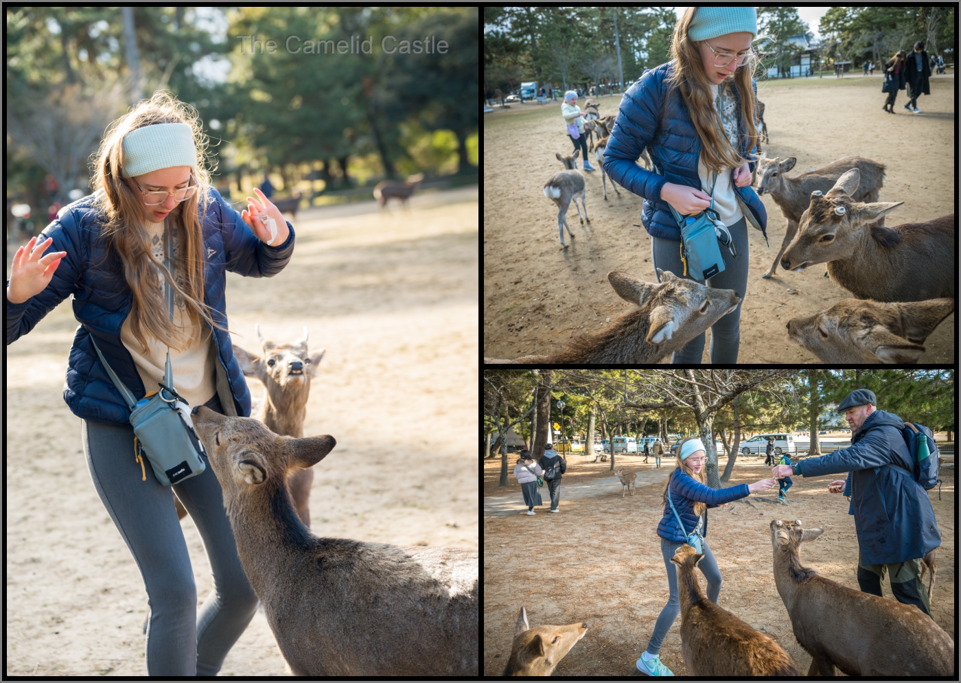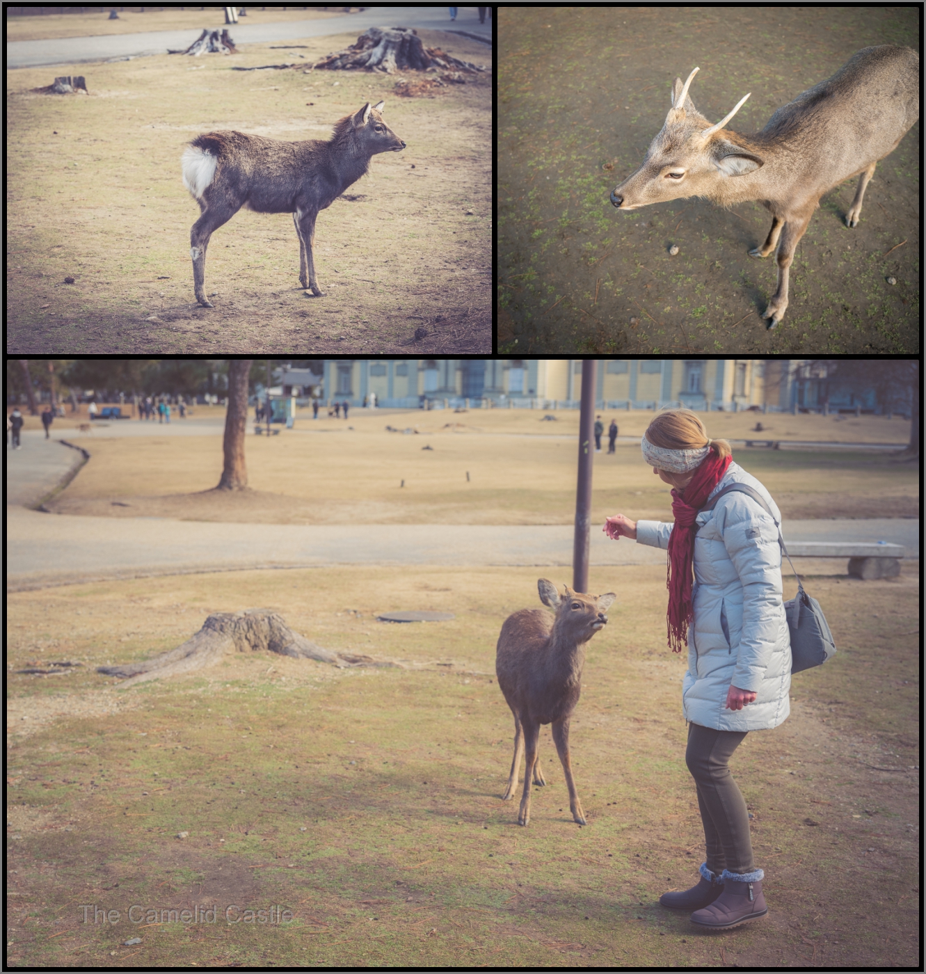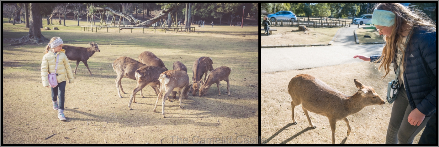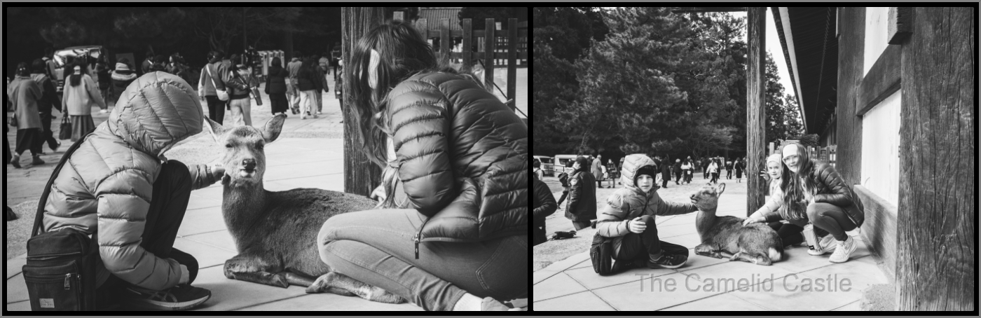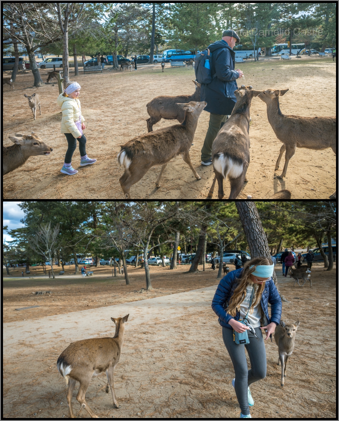 Each kid got a packet of crackers from the first deer cracker seller we found and were immediately mobbed by deer, despite there being plenty of other people around, also handing out crackers. It took about 3.2 seconds for the deer to start running at us.