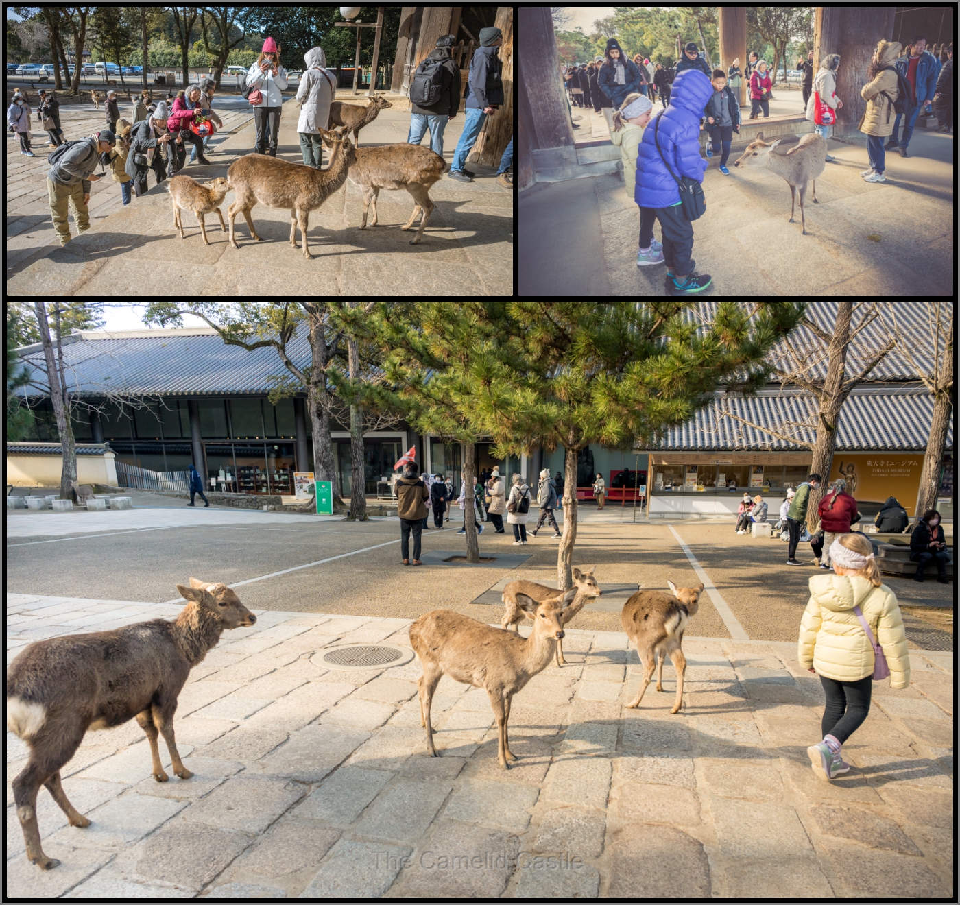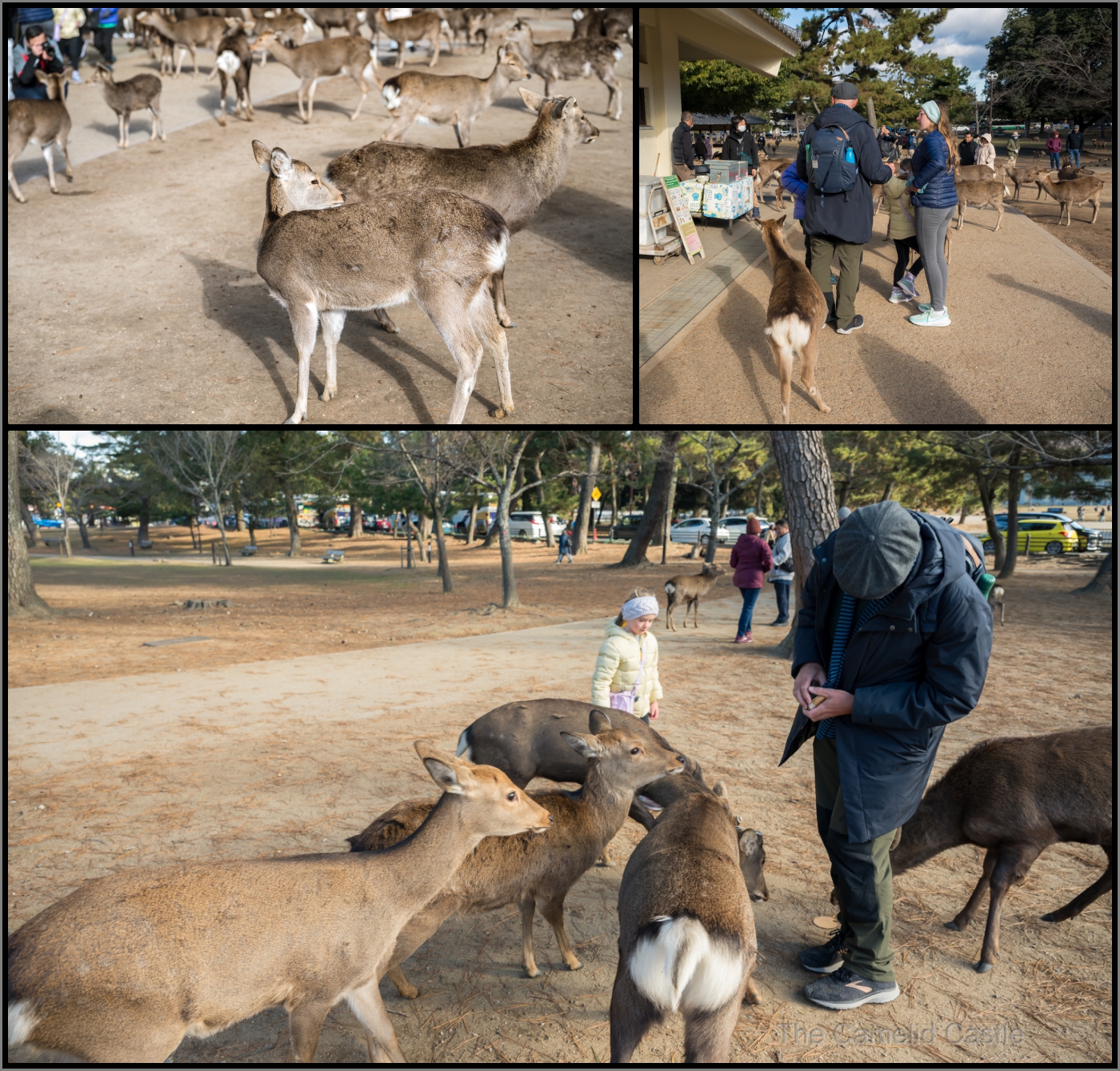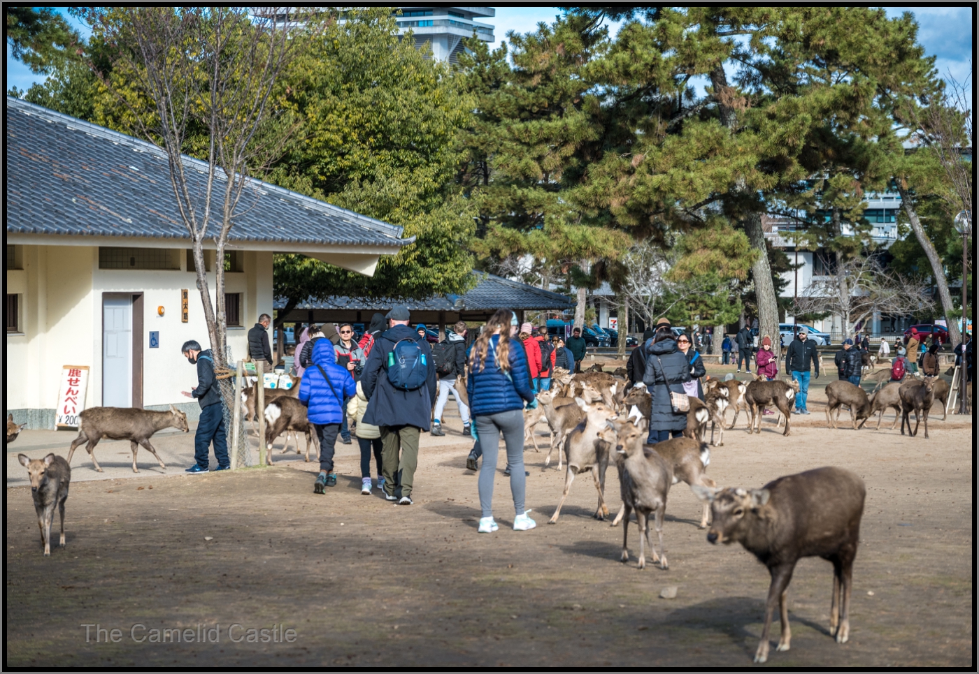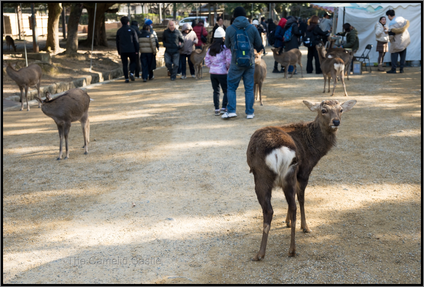 Each kid got a packet of crackers from the first deer cracker seller we found and were immediately mobbed by deer, despite there being plenty of other people around, also handing out crackers. It took about 3.2 seconds for the deer to start running at us.