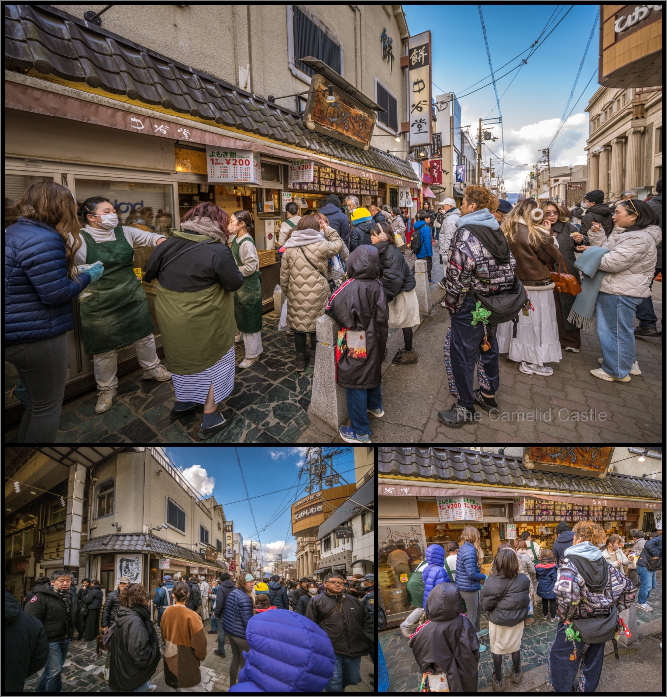With full bellies and feeling a bit warmer, we then checked out the now bustling Sanjo-dori street and succumbed to the delicious smells of fresh mochi with red bean filling and roasted soybean coating, that had huge lines.